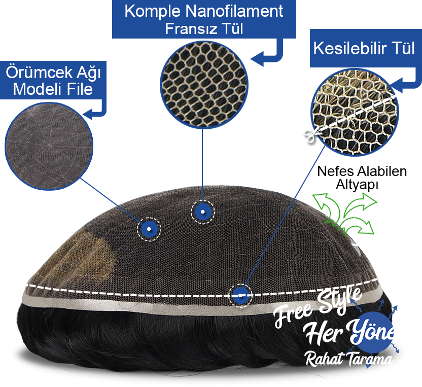 %100 Gerçek insan saçlarından üretilmiş Falugnaft Modeli Protez Saç, komple nanofilament tül olduğu için %100 hava ve su geçirgenliğine sahiptir. Bu sayede kafa deriniz oksijen alır ve derinizin su ile teması sağlanır. Ön kısımlardaki 4 cm lik bölüme Hair Bleaching tekniği ile saç ağartma uygulanmıştır. Bu sayede Saç dipleri ve düğüm yerleri, derinizin rengi ile aynı renkte görünür, alın bölgenize %100 Doğal bir görünüm kazandırır. Ön bölümdeki nanofilament tül, kullanıcının ölçülerine göre kesilebilir. Ön tül bölümde 1 cm lik bir bölüm doğallığın arttırılması için RSK tek düğüm ile işlenmiştir. Geri kalan bölümde DRSK çift düğüm kullanılmıştır. Tül ünite bantları ile bantlama yapılarak kullanılır. 15 cm saç uzunluğuna sahip Free Style Falugnaft Protez Saç Modeli ipeksi yapısı ve yönsüz oluşu sayesinde her modele rahatlıklar girer, kolay taranır. İster arkaya tarayın ister yanlara, her durumda da mükemmel sonuçlar alırsınız. Dileğinize göre sprey, wax, saç jölesi kullanabilirsiniz.
